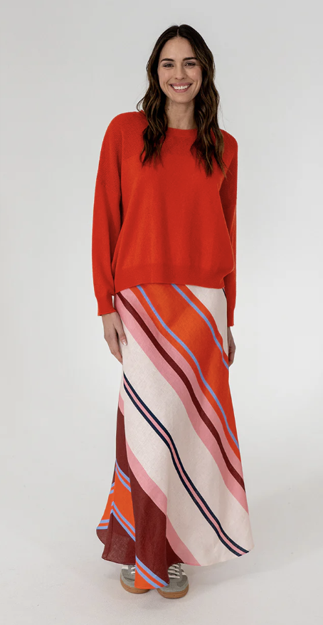 Effortlessly chic, the Austin Bias Skirt is crafted from 100% autumn-weight linen in an exclusive print, offering a perfect balance of style and comfort. The bias-cut design flatters the silhouette, creating graceful movement with every step. Featuring an elastic waistband for an easy and comfortable fit, this versatile skirt transitions seamlessly from casual to polished occasions. Pair it with a simple tee for relaxed elegance or a tailored blouse for a sophisticated look. The Austin Bias Skirt is a timeless wardrobe addition that suits any season.