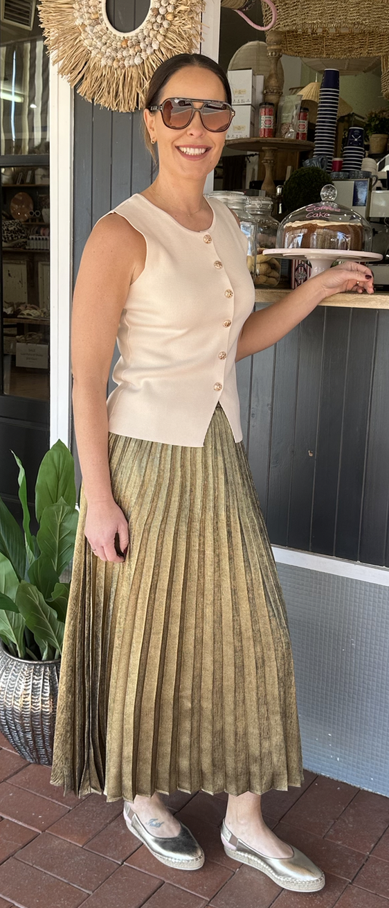 The Celine Vest is a natural coloured knit with featuring gold buttons.