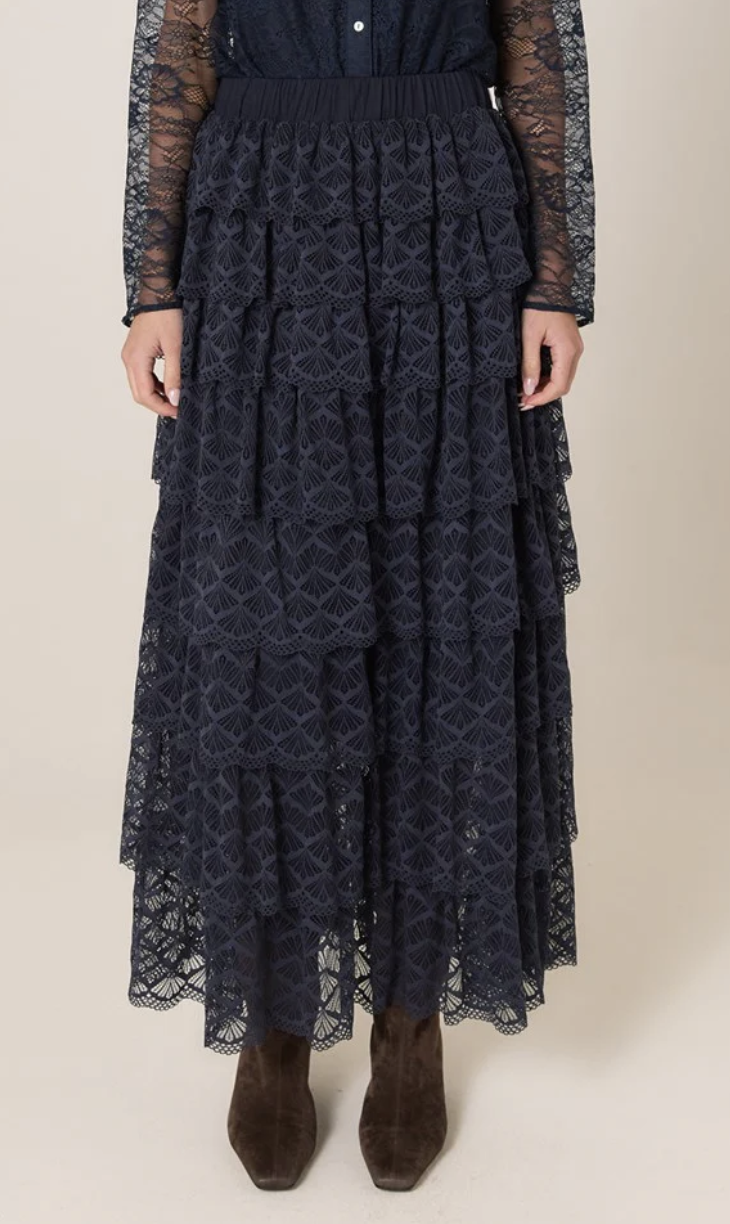 The Domino Maxi Skirt is a classic skirt that feels both modern and timeless. Featuring layered lace ruffles, lining, and an A-line shape, it includes an elasticated waistband and a regular fit. A refined piece with feminine flair.