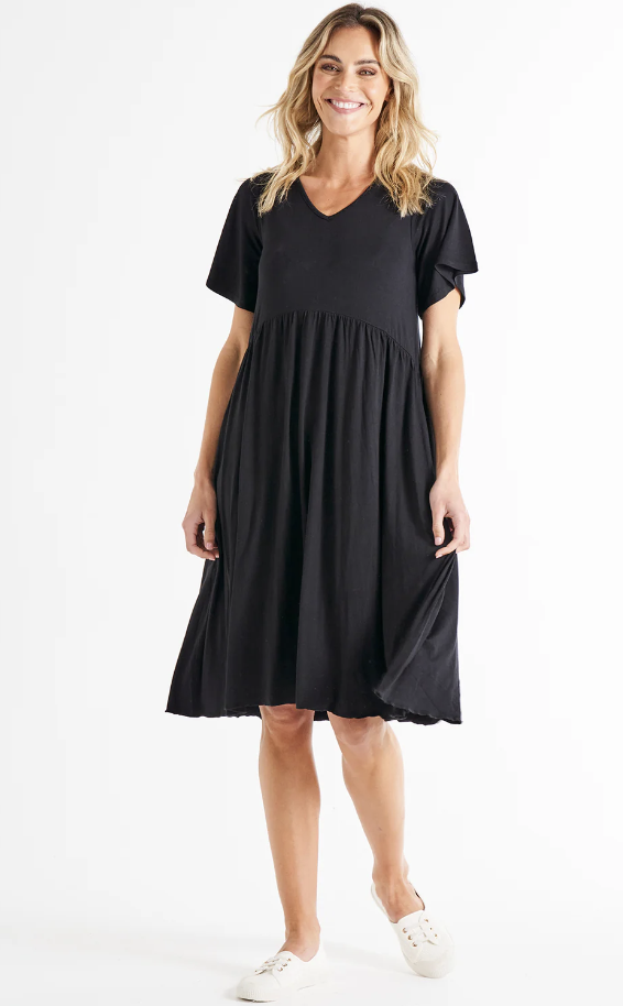 The Donna Dress is a springtime must-have, featuring a curved waist gathered seam and delicate frill sleeves. Made from soft stretch viscose jersey, this dress offers a comfortable, elevated look for any occasion.