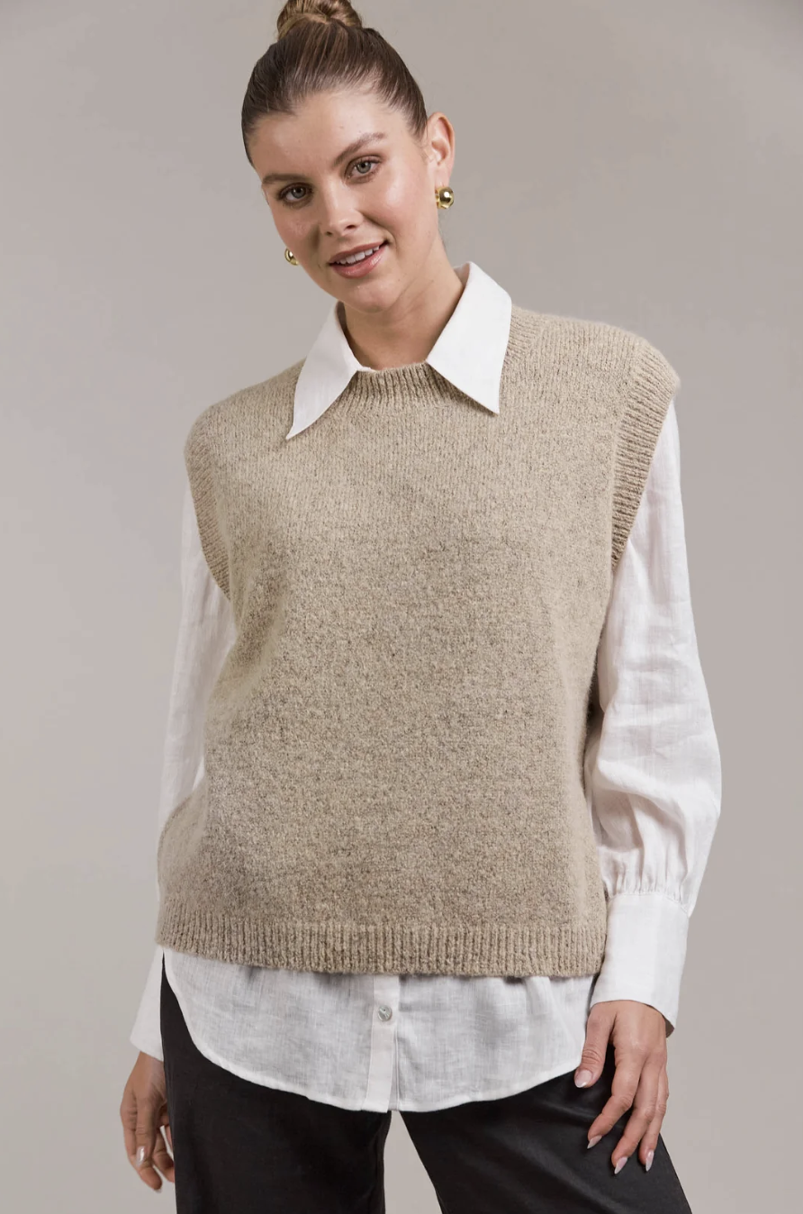 The Folie Vest brings timeless sophistication to your knitwear collection. With a sleek crewneck, sleeveless cut, and hip-length fit, this vest is designed to keep things simple yet stylish. Made from a plush wool blend, it provides warmth and comfort throughout the season. Whether styled solo or layered over a shirt, blouse, or dress, the Folie Vest adds instant polish to any look.