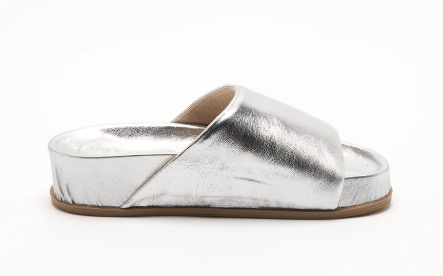 The Kendall Leather Slide in silver is the perfect blend of comfort and chic style. Crafted from soft, high-quality leather, this slide features a minimalist design with a sleek metallic silver finish that adds a touch of modern elegance to any outfit. The wide, criss-cross upper provides both coverage and style, while the cushioned footbed ensures all-day comfort. With its simple yet sophisticated silhouette, the Kendall Leather Slide is versatile enough for casual wear or to add a bit of flair to your dressier looks. Slip into effortless style with these eye-catching slides!