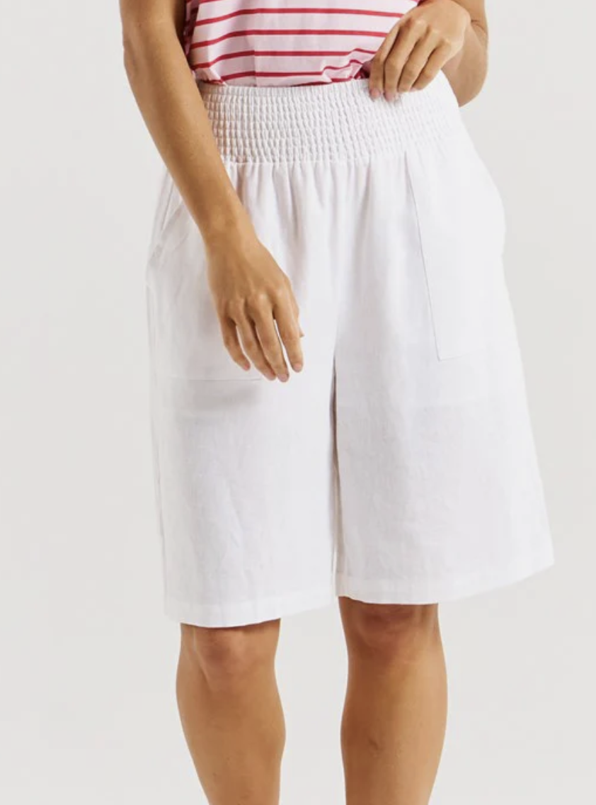 The Lee Bermuda Short in a breathable viscose/linen blend brings a refined touch with a shirred waistband and pockets. Its bermuda length makes it a polished and easy staple for warmer days.