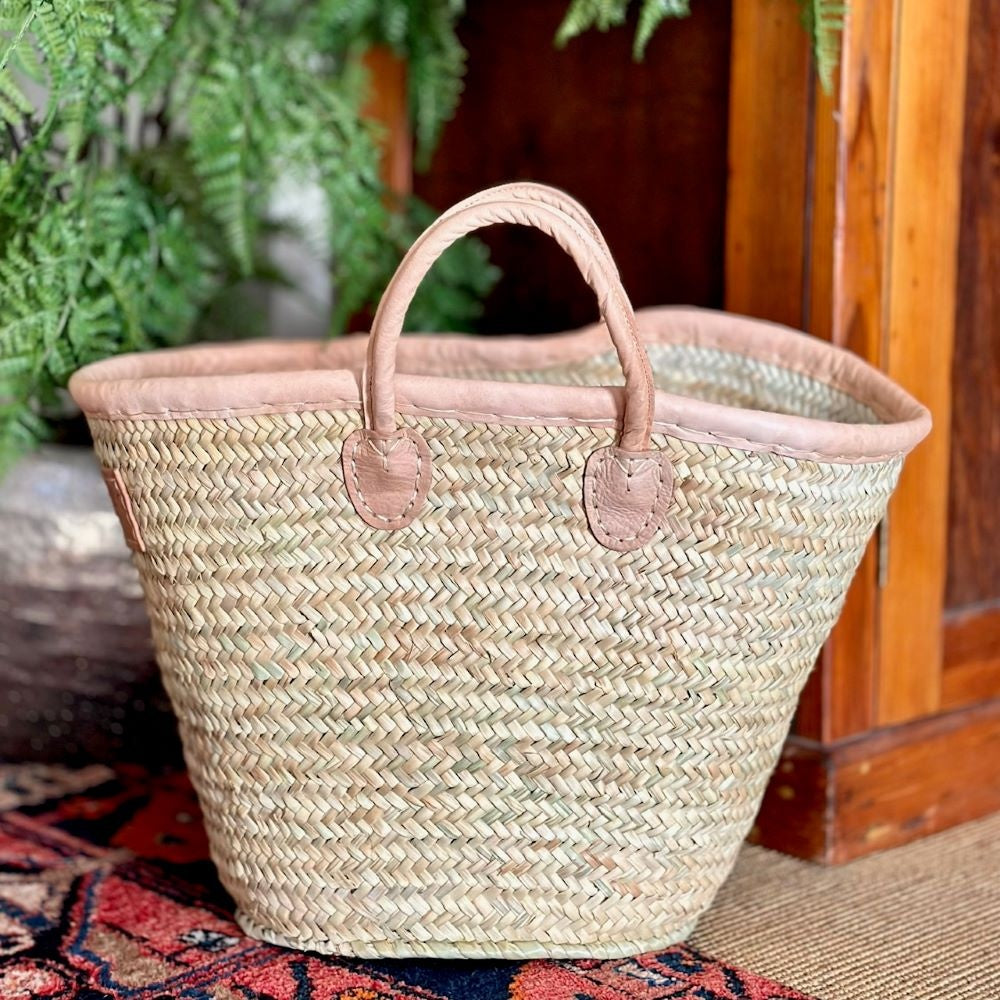 rench handwoven basket bag with thick short brown leather handles and leather trim
