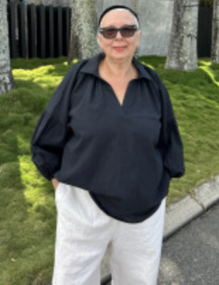 This top is known for its textured cotton fabric, mandarin neckline with a collar, full-length sleeves with elasticated cuffs, and high-low hem.