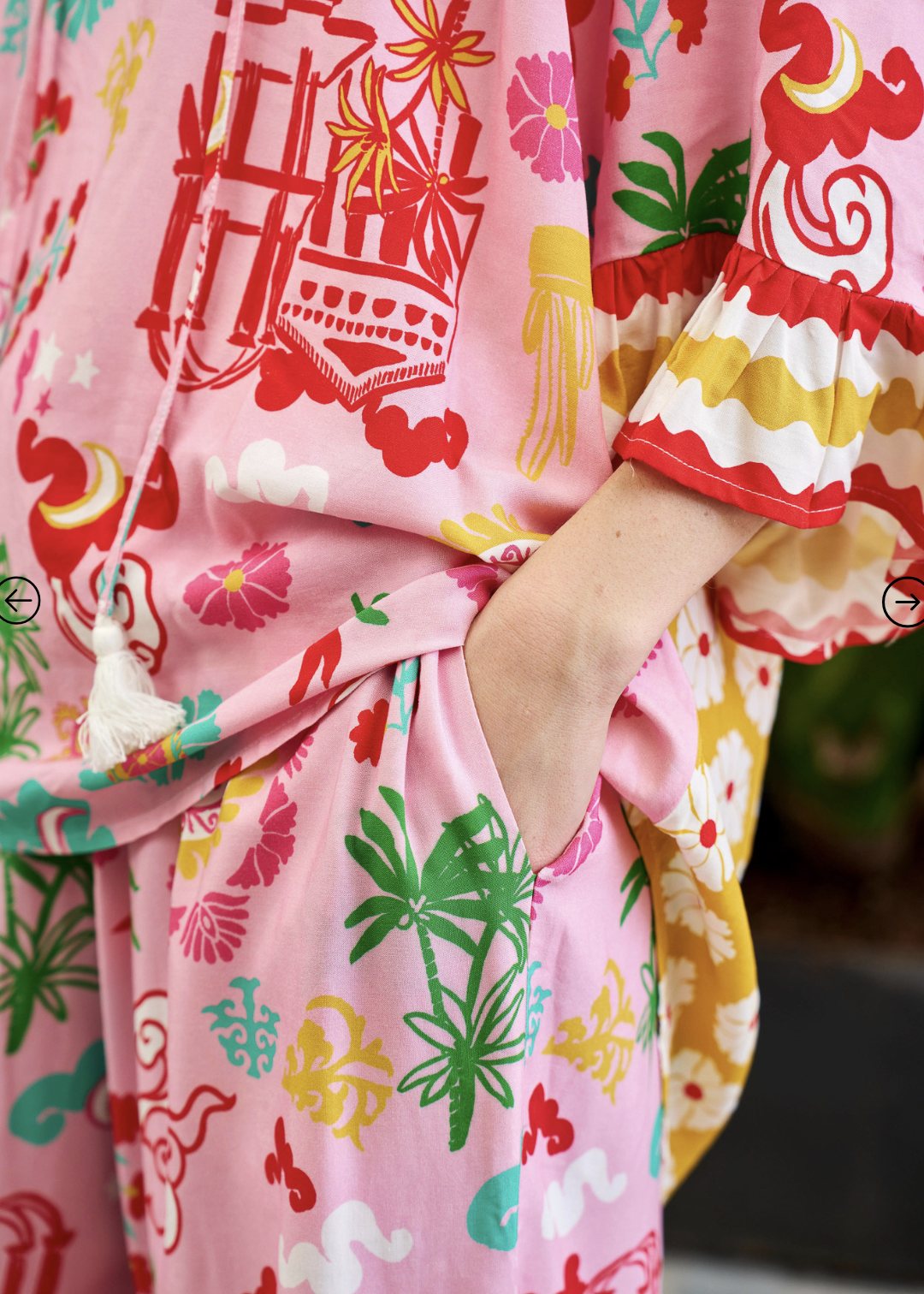-Tie strings to open to a scoop neckline– 3/4 length bell sleeves– Rick rack trim at sleeves– Exclusive print– Loose fit design– Bold colourful spliced print design