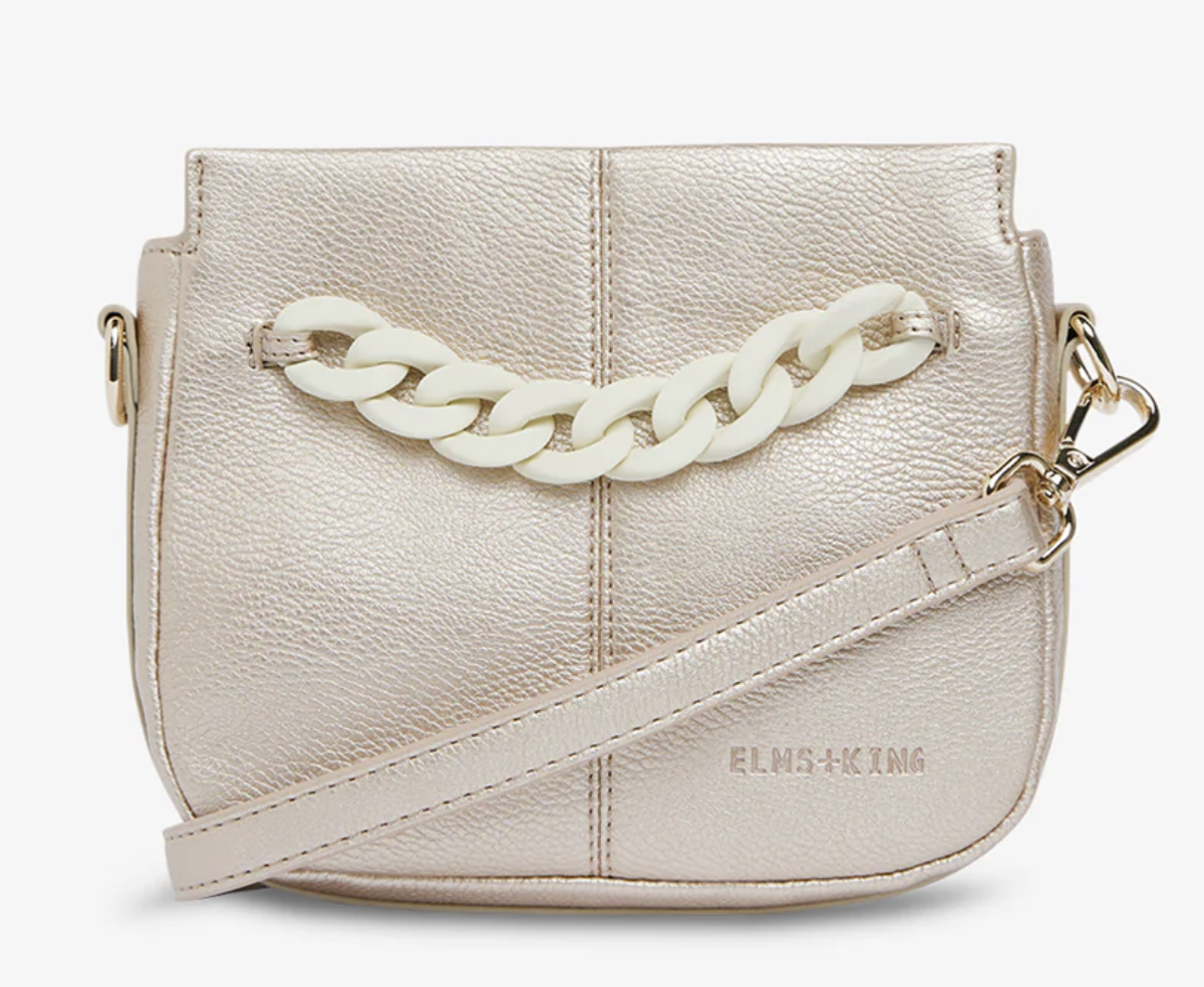 The Elms+King Mini Astor Crossbody is made from premium 100% recycled polyurethane and has blue & white gingham cotton lining. This Mini Crossbody features a front chain detail, an adjustable/removable shoulder strap and a secure, recessed top zippered closure which opens to reveal a centre compartment.