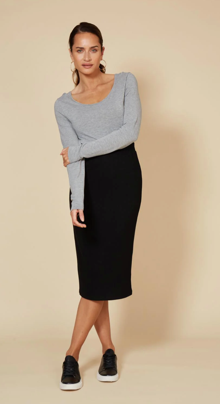 Feel your best in the Studio Jersey Skirt, made with a soft and stretchy fabric for casual comfort. Simple yet sophisticated, this figure-hugging style captures your silhouette with its flattering, midi-length design. Wear it for a casual lunch with friends by pairing it with a knit, a thick snood and sneakers.
