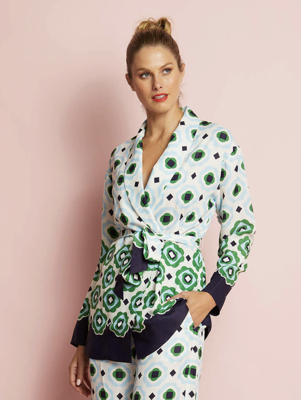 The Trinity from Arlington Milne is a shawl collared jacket with wrap front, self tie belt and snap closures. It features a slight dropped shoulder.
